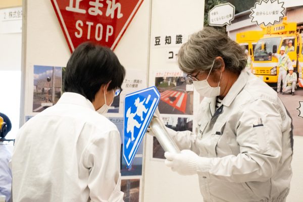 ▲製造業・道路標識の看板を手に取って説明を受ける様子