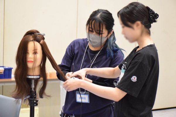 ▲サービス業・美容師のマネキンを使ったコテ巻き体験