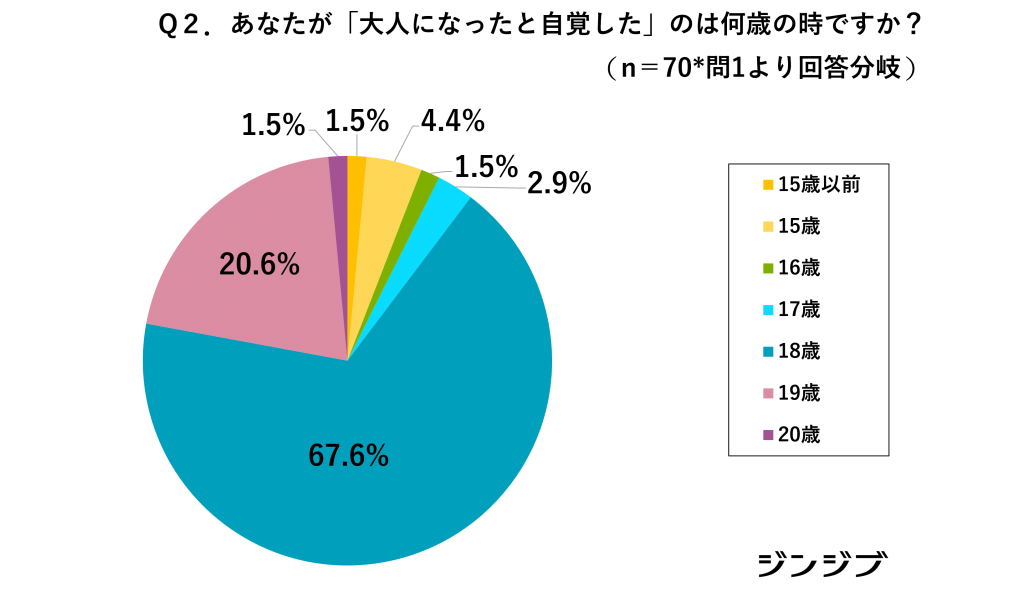 2.あなたが「大人になったと自覚した」のはいつですか? (n=70*問1より回答分岐)