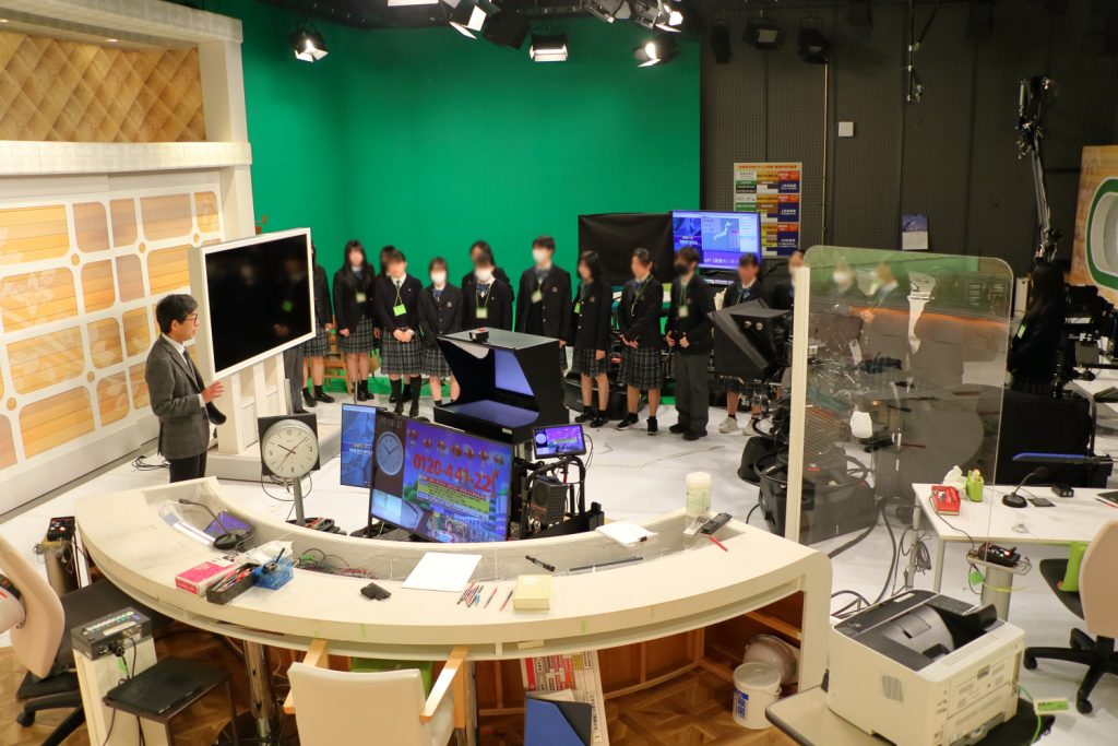 最初に、MBSの夕方の報道番組「よんチャンTV」のニューススタジオや副調整室の見学を行い、実際にニュースができる流れや関わっている人について学びました。最後に上田芹莉アナウンサーに登壇いただき、仕事のやりがいやアナウンサーのお仕事についてお話いただきました。