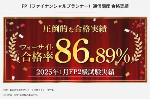 | 合格実績 | 2025年1月FP2級合格率:86.89% |