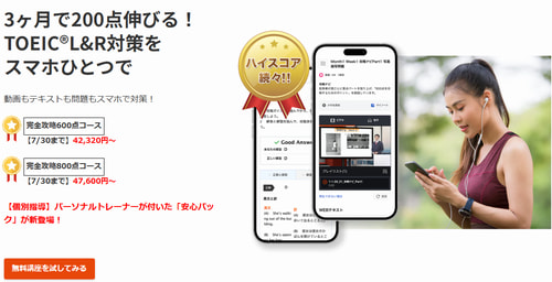 提供しているコースは「600点を目指すコース」と「800点を目指すコース」があります。初学者であれば600点コース、本格的なスコアアップを目指す人は800点コースがおすすめです。受講料はテキスト代込みで通常42,900円となっていますので、相場付近の価格設定と言えるでしょう。