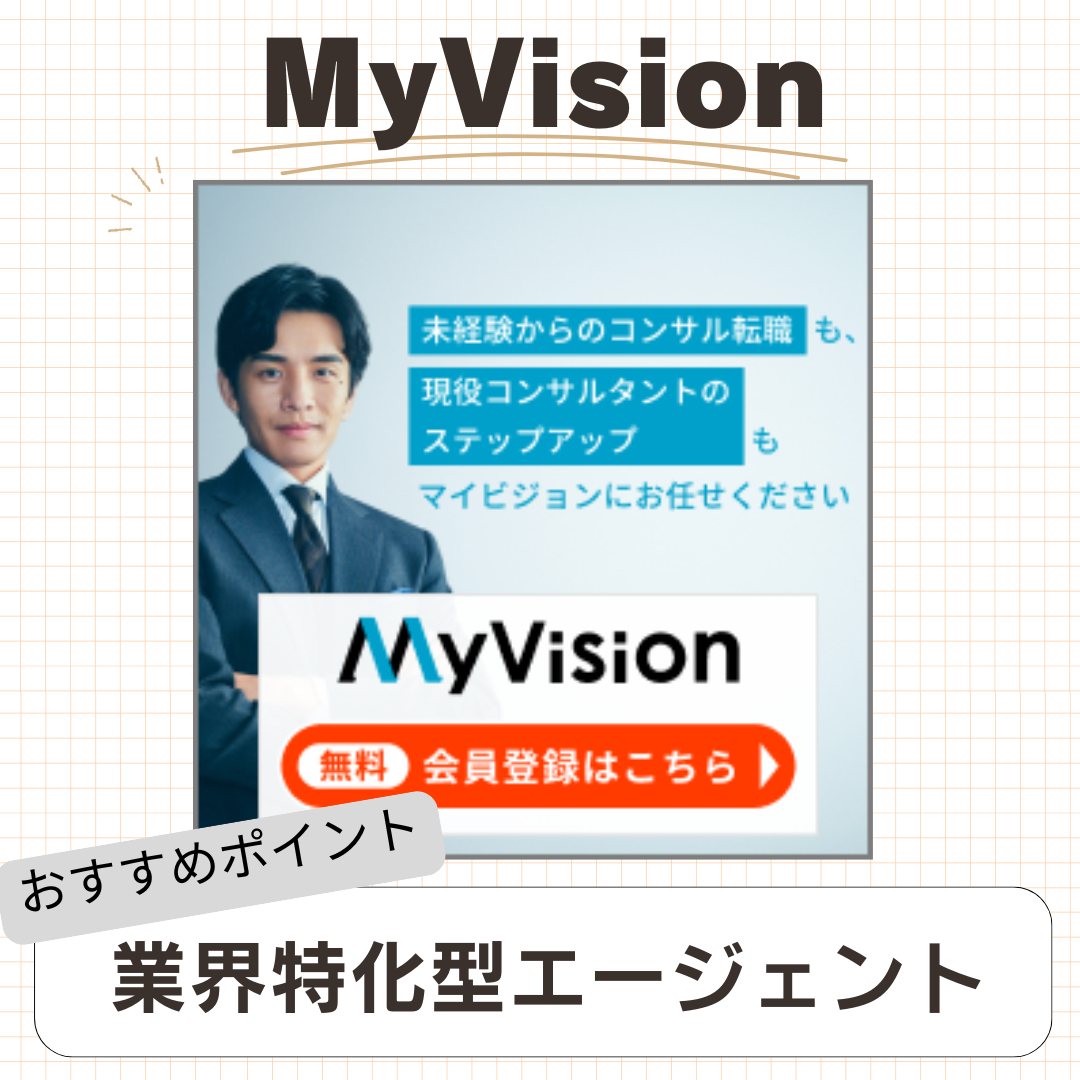 専門性の高いサポートやアドバイスがあれば、自分ひとりで転職活動するよりも選考突破率がぐっと向上するでしょう。特に「MyVision」は、難関ファームへの高い内定実績と手厚い選考対策で知られ、今最も注目すべきエージェントのひとつです。