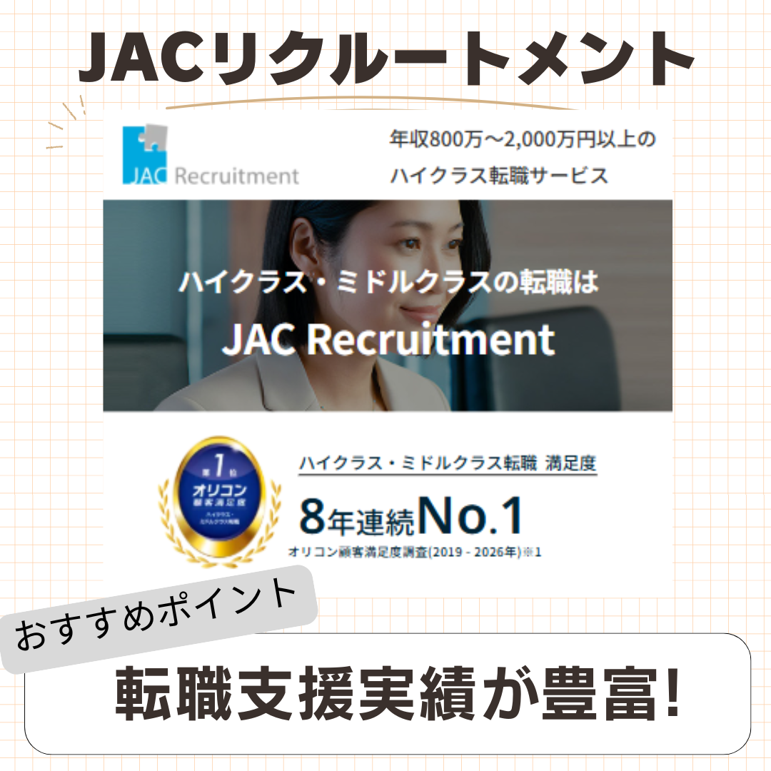 JACリクルートメントは、管理職・専門職のハイクラス転職に特化した転職エージェントです。